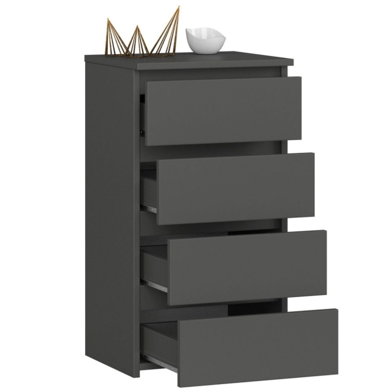 Elegantní komoda CL4 představuje dokonalého spojence pro váš domov. Tato komoda v grafitově šedé barvě se čtyřmi zásuvkami se vyznačuje nejen svým vkusným designem, ale také praktickým využitím prostoru. Je to více než jen kus nábytku; je to prostor, kde můžete efektivně uschovat a organizovat své nejdůležitější věci s lehkostí a stylem.