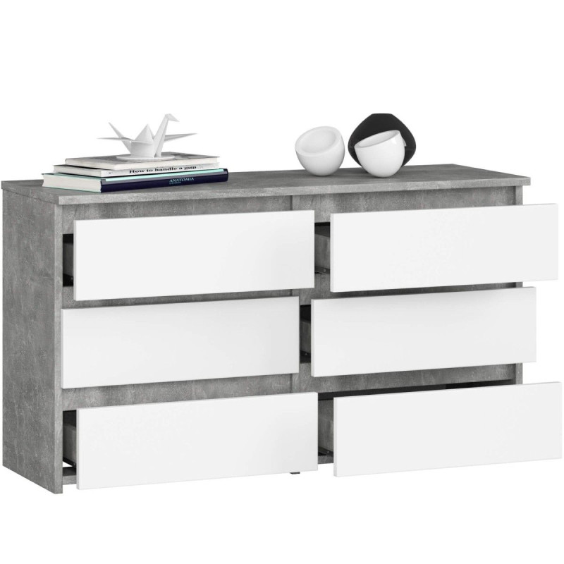 Sháníte stylový úložný prostor do moderního interiéru? Komoda CL je naprosto ideální volbou! Vyniká unikátním designem kombinujícím bílou s odstínem betonu, který podtrhne nadčasové prostory s neobvyklými dekory. Je vyhotovena z 16 mm silné laminované desky zajišťující odolnost a dlouhou životnost. Její hrany jsou zabezpečeny ABS hmotou, tudíž nedojde k žádnému zranění či poškození zdí. Komoda taktéž disponuje šesti prostornými zásuvkami, do kterých ukryjete i ty nejvzácnější poklady.. nebo například doklady. To už je čistě na vaší fantazii!
