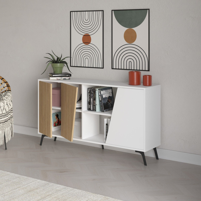 Komoda nabízí velkorysý úložný prostor se třemi dvířkami a otevřenou části rozdělenou policí. Dvě z dvířek komody jsou zkosená, čímž uprostřed vytváří již zmíněný odhalený úložný prostor.