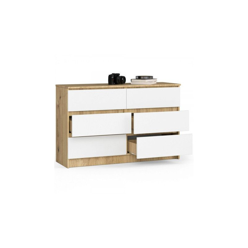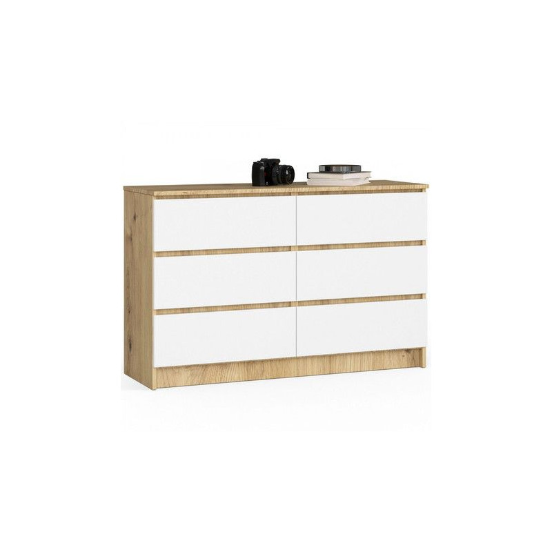 Komoda K140 6SZ. Kdo by nesnil o pevné, elegantní a funkční komodě. Jedná se o oblíbený kus nábytku, který v naší nabídce nemohl chybět. Nábytek vypadá vizuálně zajímavě, hodí se tak do obývacího pokoje, ložnice, obývacího pokoje nebo předsíně. Údržba: Povrch nábytku otírejte vlhčeným hadříkem. Vyhněte se použití chemikálií.