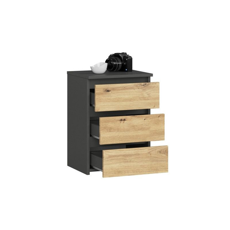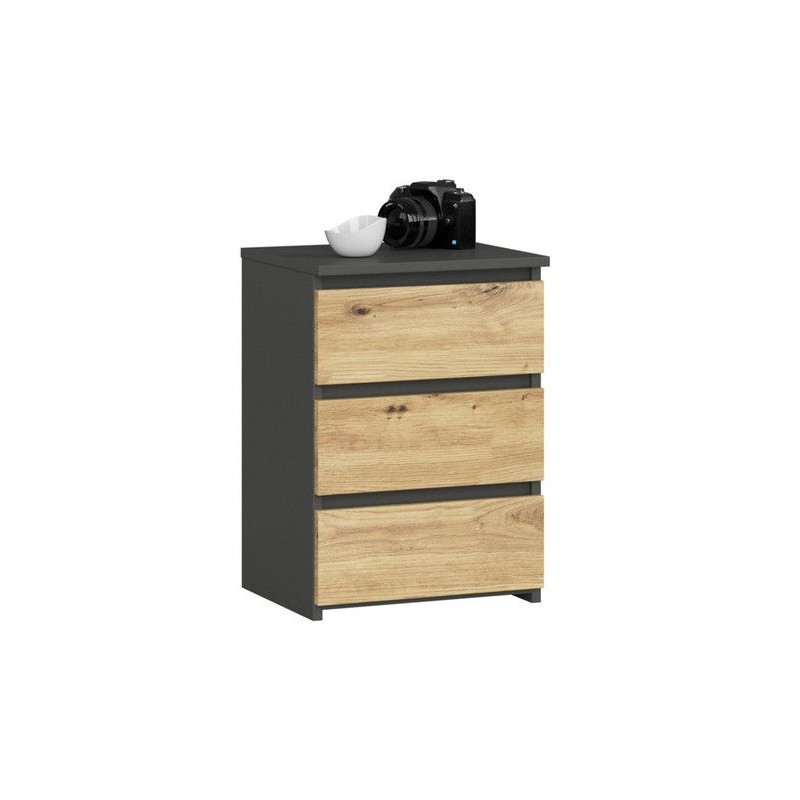 Komoda CL3/40 - grafit/dub artisan. Komoda CL3/40 je oblíbeným typem nábytku, který můžete umístit vedle postele jako noční stolek. Bude vypadat krásně v každé ložnici. Může být také umístěna v dětském pokoji. - jednoduchý a moderní design - hladké boky - zásuvky se pohybují na kovových kolejnicích - snadná montáž Údržba: Povrch nábytku utřete do čista měkkým hadříkem. Vyhněte se použití chemikálií.