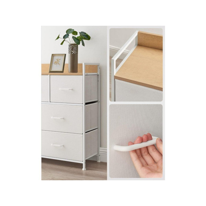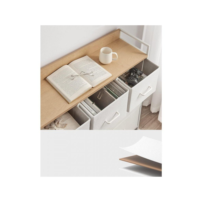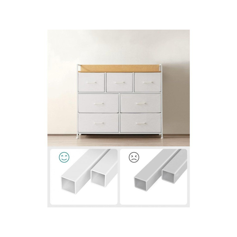 S bílou kovovou konstrukcí, dřevěnou odkládací deskou a různě velkými zásuvkami je tato komoda ideálním úložným řešením pro váš obývací pokoj, ložnici nebo předsíň. Sedmičlenný úložný prostor v kombinaci s moderním designem a odolnými materiály, jako je nerezová ocel, MDF dřevotřísková deska a polyesterová bílá tkanina, z ní dělá nejen stylový, ale i praktický kousek nábytku.
