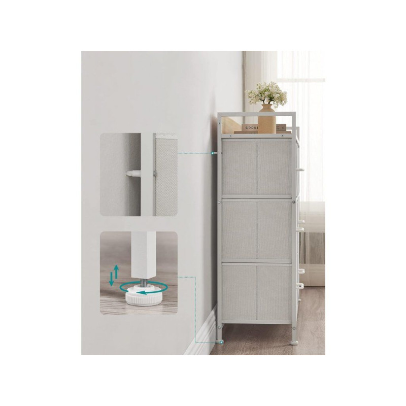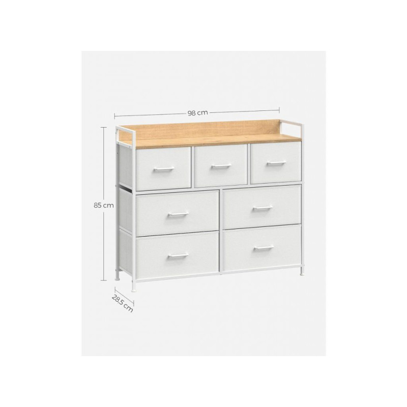 Oživte svůj prostor s komodou s látkovými zásuvkami Busman v elegantní bílé barvě. Se 7 zásuvkami, z nichž 4 jsou velké a 3 malé, tato multifunkční industriální kráska nabízí nejen dostatek úložného prostoru, ale také přináší do vašeho interiéru šmrnc a praktičnost. Nastavitelné nožičky zajistí stabilitu i na nerovných podlahách, zatímco dodávaná ochrana proti převrácení dodává pocit bezpečí.