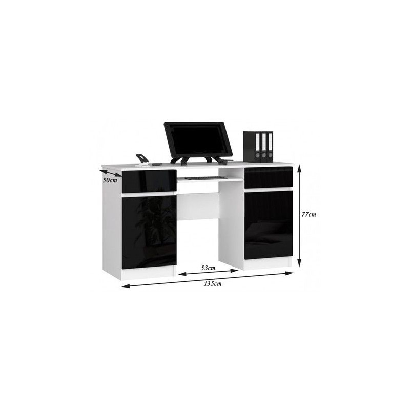 Počítačový stůl A5. Jednoduchý stůl v moderním barevném provedení. Stůl je vhodný do kanceláře i do dětského pokoje. Využití najde při práci s počítačem i při psaní domácích úkolů. Díky své velikosti se dobře vejde i do menších prostor. - jednoduchý a moderní design vytváří příjemný pracovní prostor - hladké boky - v lesku pouze pohledová strana - 2 zásuvky a police na klávesnici se pohybují na kovových válečkových vodítkách - 2 skříňky s policí - snadná montáž Údržba: Povrch nábytku utřete do čista měkkým hadříkem. Vyhněte se použití chemikálií. Foto je pouze ilustrační.