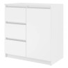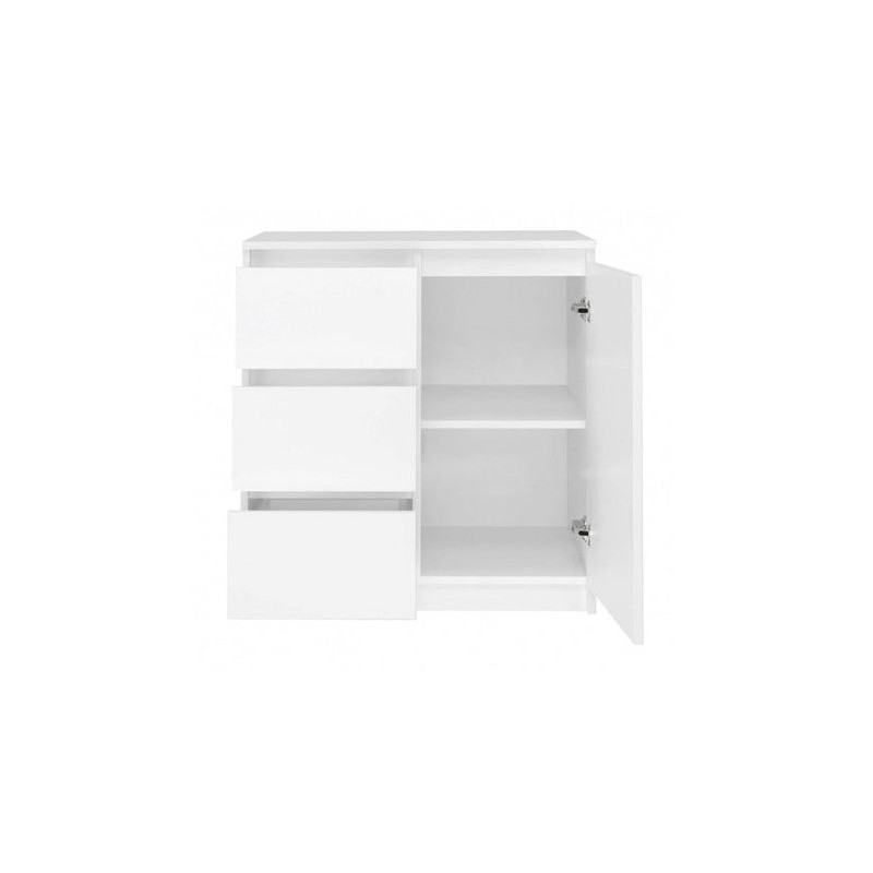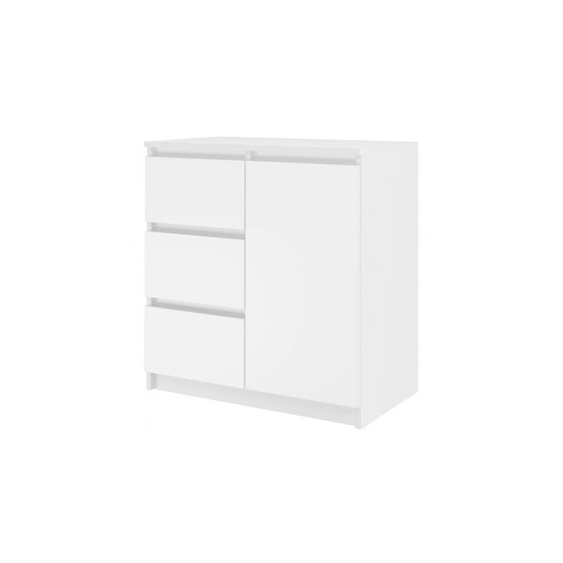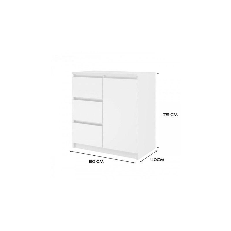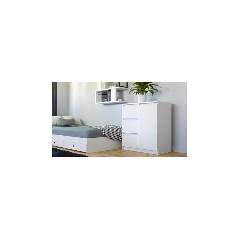 Moderní komoda 1D3S je funkční kus nábytku, který ozdobí interiér vaší ložnice, obývacího pokoje nebo dětského pokoje. Univerzální vzhled splní očekávání všech, kteří oceňují spojení jednoduchosti a elegance. Vnitřek komody se skládá z polic a zásuvek, které vám pomohou věci uspořádat. - Minimalistický design. - Bezúchytková čela zásuvek a dvířek zajišťují pohodlné používání a zdůrazňují modernistický charakter interiéru. - Velmi dobrá kvalita zpracování. Údržba: Očistěte povrch nábytku měkkým hadříkem. Vyhněte se používání silných chemikálií.
