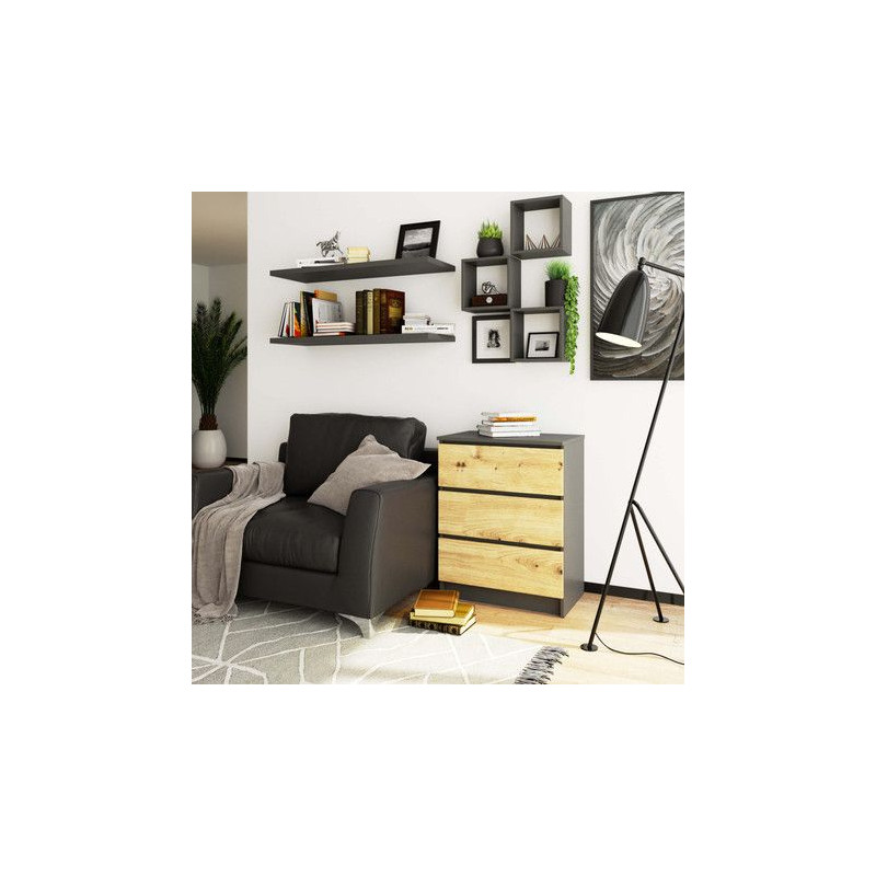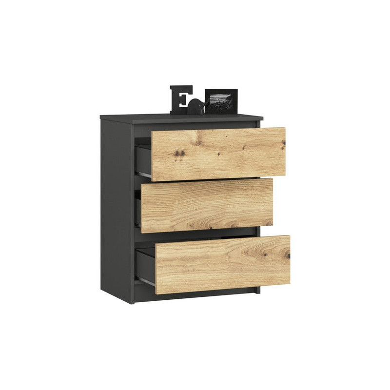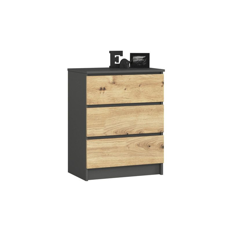 Komoda K60 3SZ - grafit/dub artisan. Jednoduchá a moderní komoda. Je vyrobená z pevné laminované desky, která je odolná proti oděru a poškození. Univerzální vzhled splní očekávání každého, kdo ocení kombinaci jednoduchosti a elegance. Bezúchytková čela zásuvek zajišťují pohodlné používání. - použití kvalitních materiálů - zajímavé provedení - snadná montáž Údržba: Povrch nábytku utřete do čista měkkým hadříkem. Vyhněte se použití chemikálií.