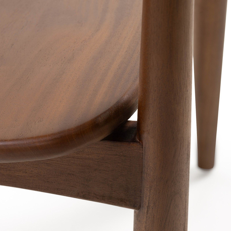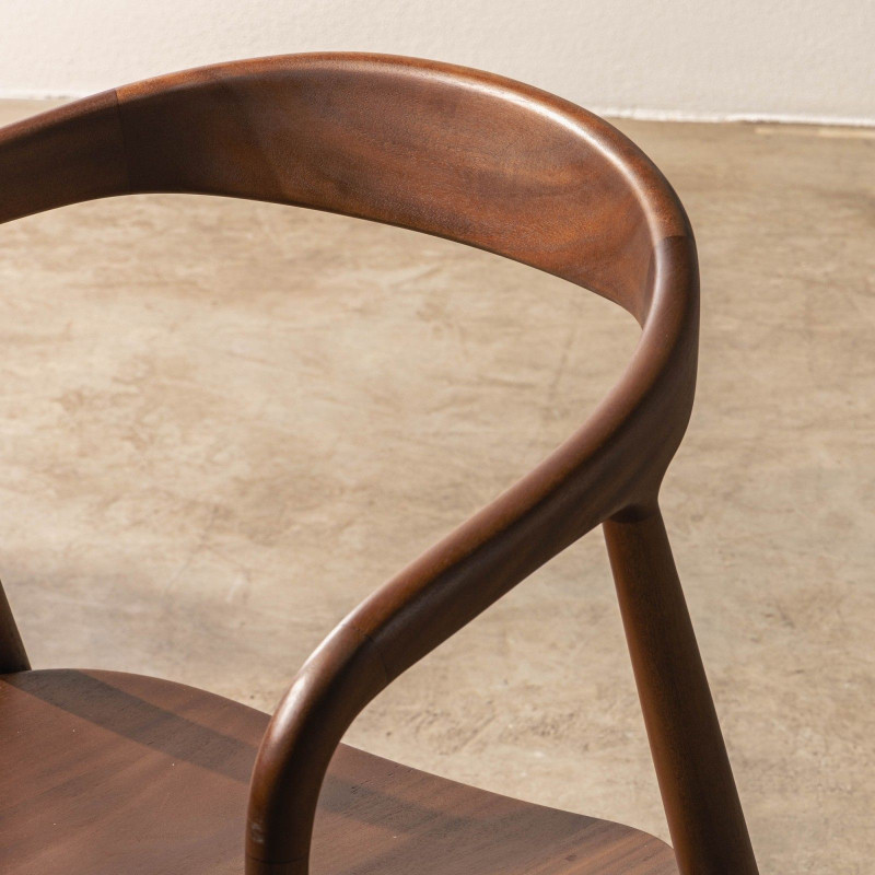 Celá konstrukce je vyrobena z masivního mahagonového dřeva – materiálu ceněného pro svou pevnost, hustotu a výjimečně dlouhou životnost. Dřevo není jen estetickým prvkem, ale i nositelem kvality, která obstojí ve zkoušce času. Povrch v teplém ořechovém tónu přirozeně zvýrazňuje kresbu dřeva a umocňuje jeho ušlechtilost. Každý kus je originál – drobné nerovnosti, suky nebo přirozené trhliny jsou důkazem pravosti a dodávají židli nezaměnitelný charakter.