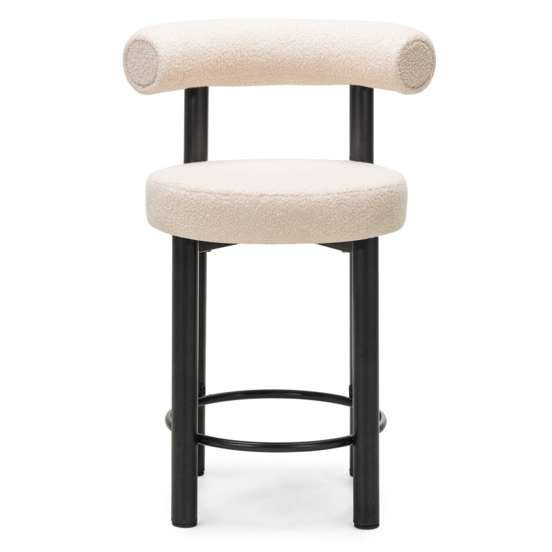 Barová židle Pedro je skutečným ztělesněním elegance a moderního komfortu. Její zaoblené opěradlo vytváří stylový a harmonický tvar, který nejenže působí esteticky, ale také poskytuje výjimečnou oporu. Opěradlo a sedák jsou potaženy luxusní bouclé látkou v jemném odstínu ecru, která přidává židli na sofistikovanosti a zároveň vytváří hřejivou atmosféru v interiéru. Zatímto kovové černé nohy vytváří příjemný kontrast.