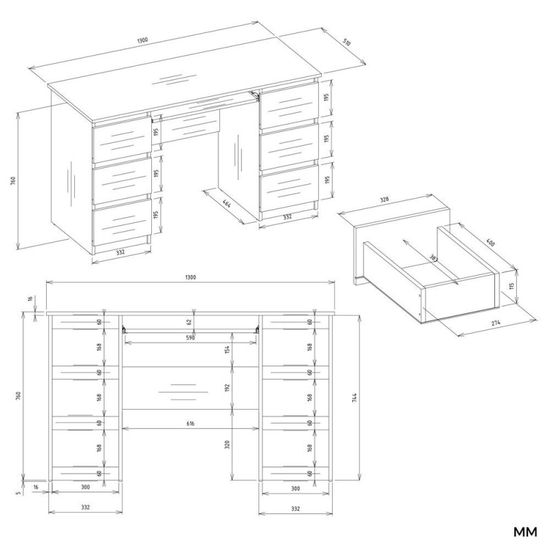 Stůl i nástavba jsou vyrobeny z odolné 16mm laminované dřevotřísky, která je nenáročná na údržbu a odolná proti poškrábání. Šest prostorných šuplíků na válečkových kolejničkách poskytuje dostatek místa pro dokumenty, sešity i drobnosti, zatímco výsuvná police na klávesnici přispívá k pohodlnému a zdravému sezení u počítače.