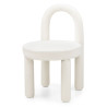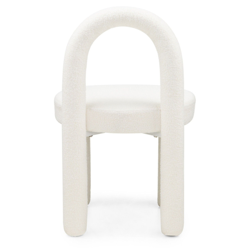 Povrch židle je čalouněný elegantní látkou bouclé v jemné béžové ecru barvě, která působí nadčasově a přitom vnáší do prostoru teplý a sofistikovaný nádech. Tato látka je mimořádně příjemná na dotek, její texturovaný povrch dodává židli zajímavý charakter a zároveň zvyšuje její komfort. Celý kousek je doplněný čalouněnými nohami, které umocňují pocit luxusu a zajišťují stabilitu.