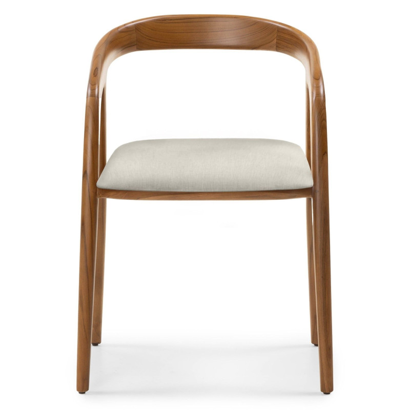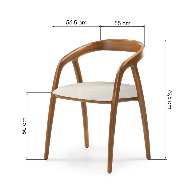 Tělo židle je vyrobené z pravého teakového dřeva, známého svou mimořádnou pevností, dlouhou životností a odolností vůči opotřebení. Hnědá povrchová úprava zvýrazňuje přirozenou kresbu dřeva a dodává celku noblesní charakter. Každý kus je originál – drobné rozdíly ve struktuře a odstínu dřeva podtrhují autentičnost přírodního materiálu a vnášejí do prostoru jedinečnost, kterou nelze napodobit.