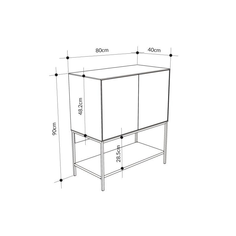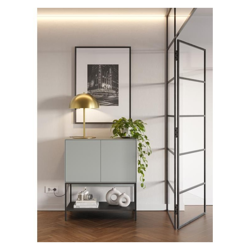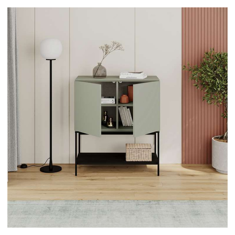 Komoda Amira stojí na pevných kovových nohách v černé barvě, které zajišťují stabilitu a zároveň dodávají moderní, vzdušný vzhled. Díky systému push-to-open se dvířka otevírají snadno – bez úchytek, bez rušivých detailů. Praktické vnitřní police nabízí dostatek úložného prostoru s nosností až 15 kg, ideální pro dokumenty, oblečení nebo drobnosti, které chcete mít po ruce.
