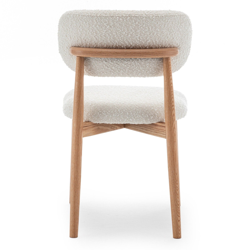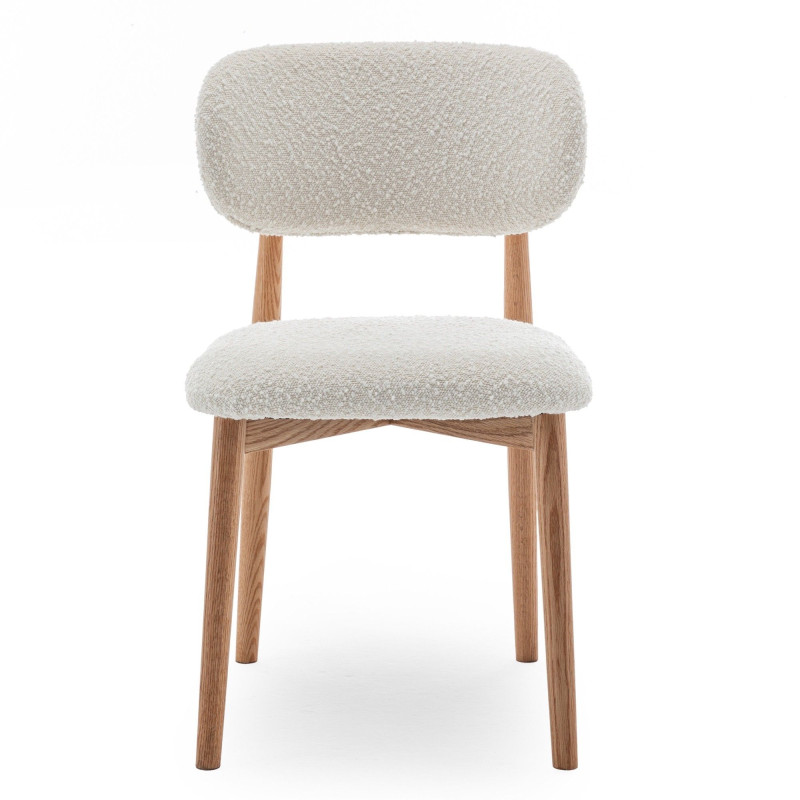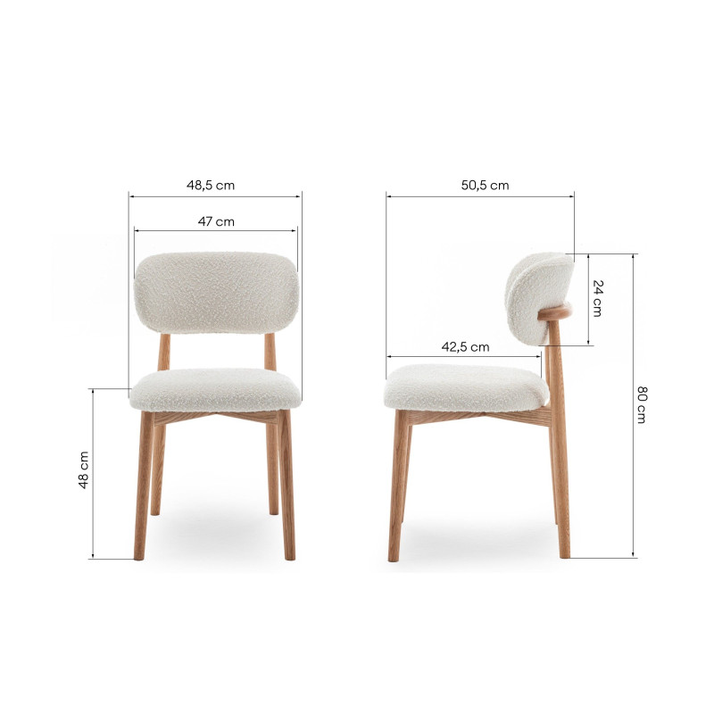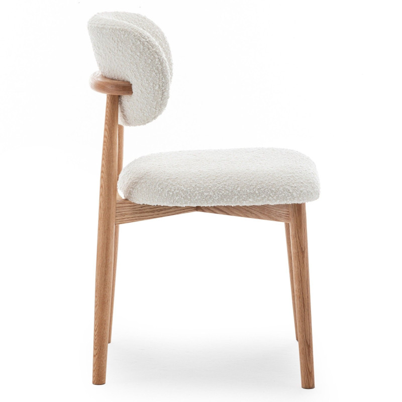 Sedák a opěradlo židle Amalfi jsou čalouněny tkaninou bouclé v jemném odstínu ecru. Tato látka je známá svým unikátním strukturovaným povrchem, který dodává židli moderní a zároveň hřejivý vzhled. Boucle je nejen vizuálně atraktivní, ale také příjemná na dotek a snadná na údržbu, což oceníte v každodenním provozu.