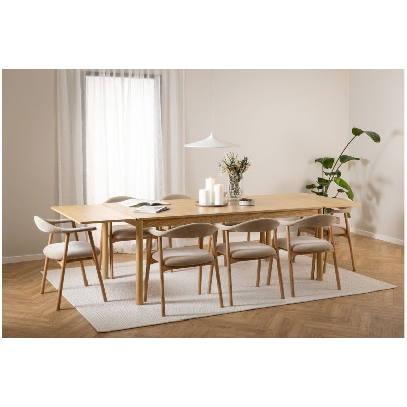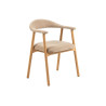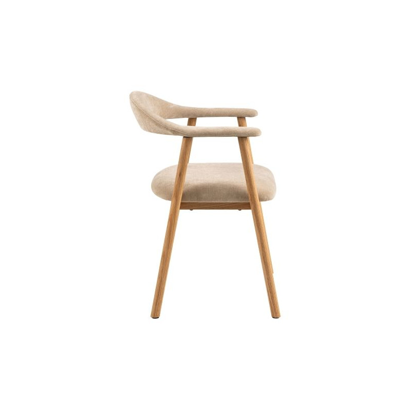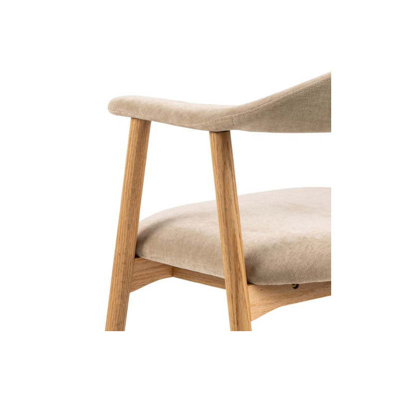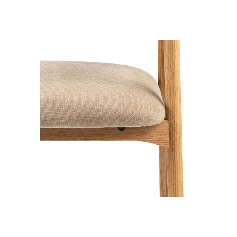 Rám židle je vyroben z masivního dubového dřeva, které jé pevné, trvanlivé a má nádhernou kresbou dodávající interiéru přirozený charakter. Povrch dřeva je ošetřen olejem, který zvýrazňuje jeho texturu a chrání ho před vlhkostí i drobnými poškozeními. Navíc, certifikace FSC® zaručuje, že dřevo pochází z odpovědně obhospodařovaných lesů, čímž židle splňuje i ekologické standardy. Sedák a opěradlo jsou čalouněny látkou Danny v univerzálním, avšak útulném béžovém odstínu.